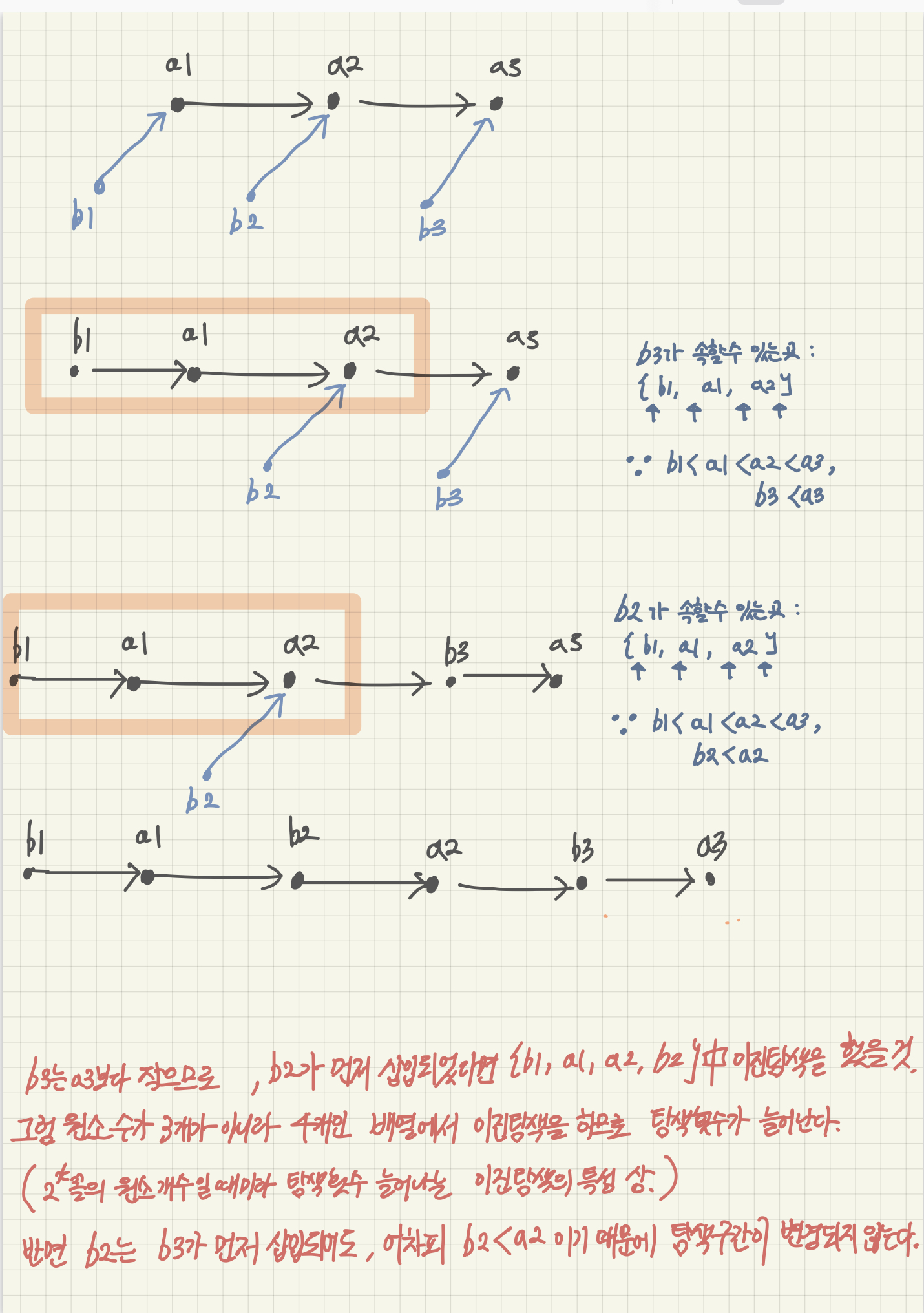 2. ak > bk 이라는 점을 이용해서 bk를 이진 탐색으로 삽입할 때 탐색 대상의 범위가 ak 이전의 수들임을 이해한다.