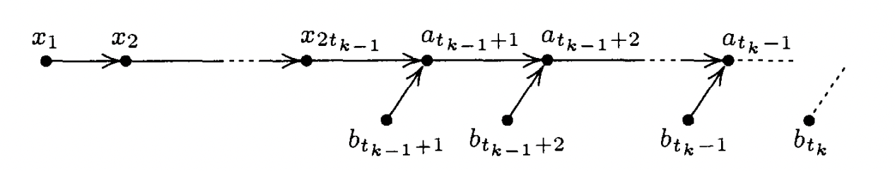 그 개수는 다음과 같다.(bt(k-1)에 도달하기까지의 추가된 원소수 (b1 ~ bt(k-1), 위위 그림에서 x) + a수열의 개수(a1~ a(t(k-1)) + (실제로 더해진 b수열의 개수(t(k) - (t -k(k-1) -1 ))
