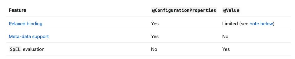 - @ConfigurationProperties는 지원하는 반면 @Value는 제한적으로 지원한다.