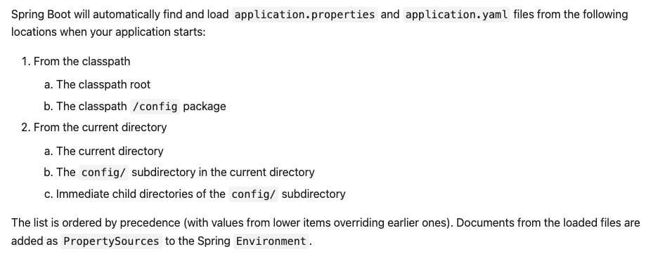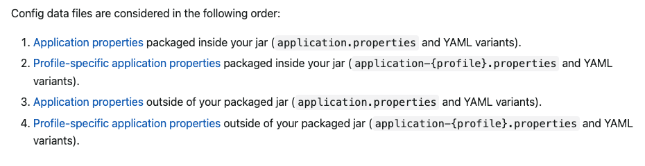 1순위로 고려되는 것이 applicaton.properties 이며, 이후에 'profile' 이 추가되었거나, 외부의 application.properties 파일들이 후순위로 고려된다고 이해하면 된다.