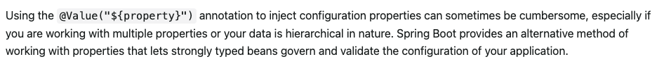 Spring 공식문서에서는 나만의 컴포넌트를 위해서 configuration 을 세팅하는 거라면 @ConfigurationProperties로 어노테이션 된 POJO에 모아놓을 것을 추천한다. 이렇게 하면 bean에 주입 시에 더 구조화되고, type-safe object를 제공할 것이라 말한다.