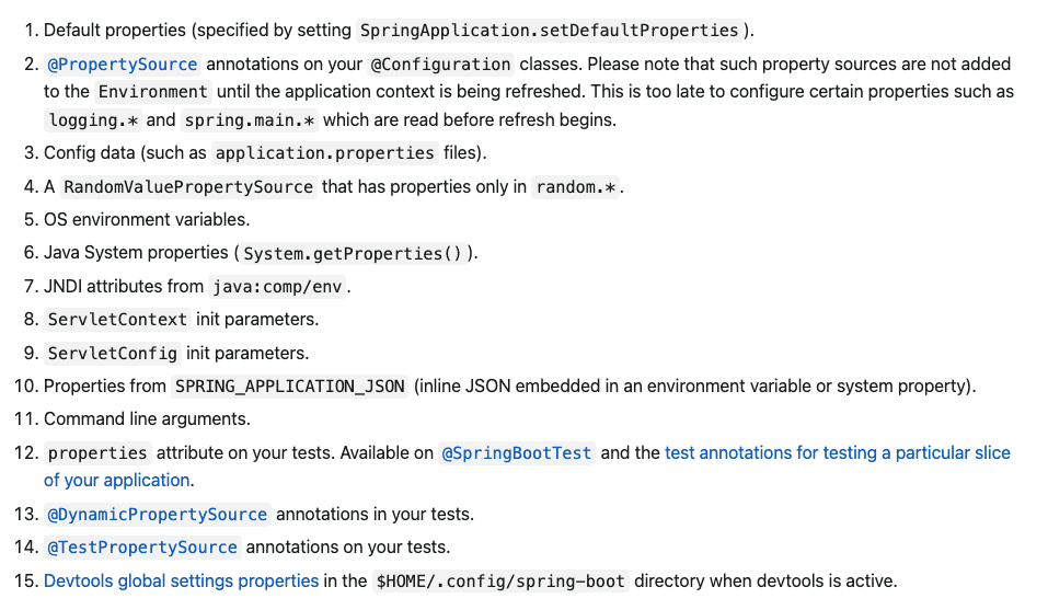 기본적으로 spring에서 propertysource 값이 오버라이딩되는 순서는 다음과 같다.
