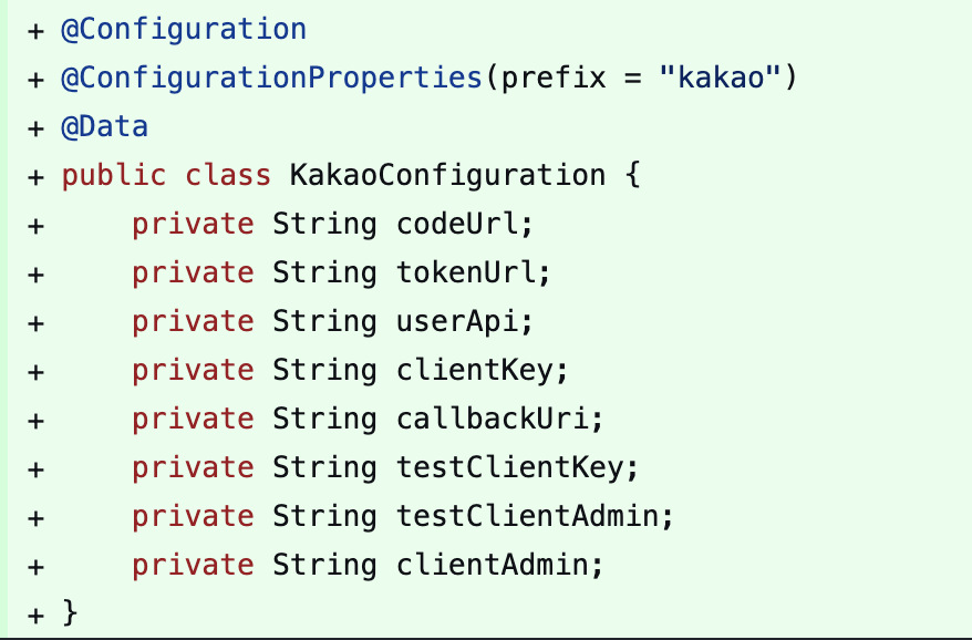 나의 경우 생성자 바인딩까지는 필요없었고, @Value를 사용했던 기존 코드에서 @ConfiguratonProperties 로 바꾸는 작업을 진행했다.결론적으로 레포지토리에 적용된 코드는 다음과 같다.