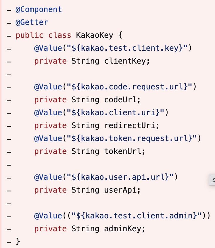 사이드 프로젝트를 하면서 동료 개발자분께서 Components/KakaoKey 의 존재 이유를 여쭤보셨다. application.properties 의 값을 @Value 어노테이션을 이용해 가져와 저장하는 목적의 클래스들이었다.