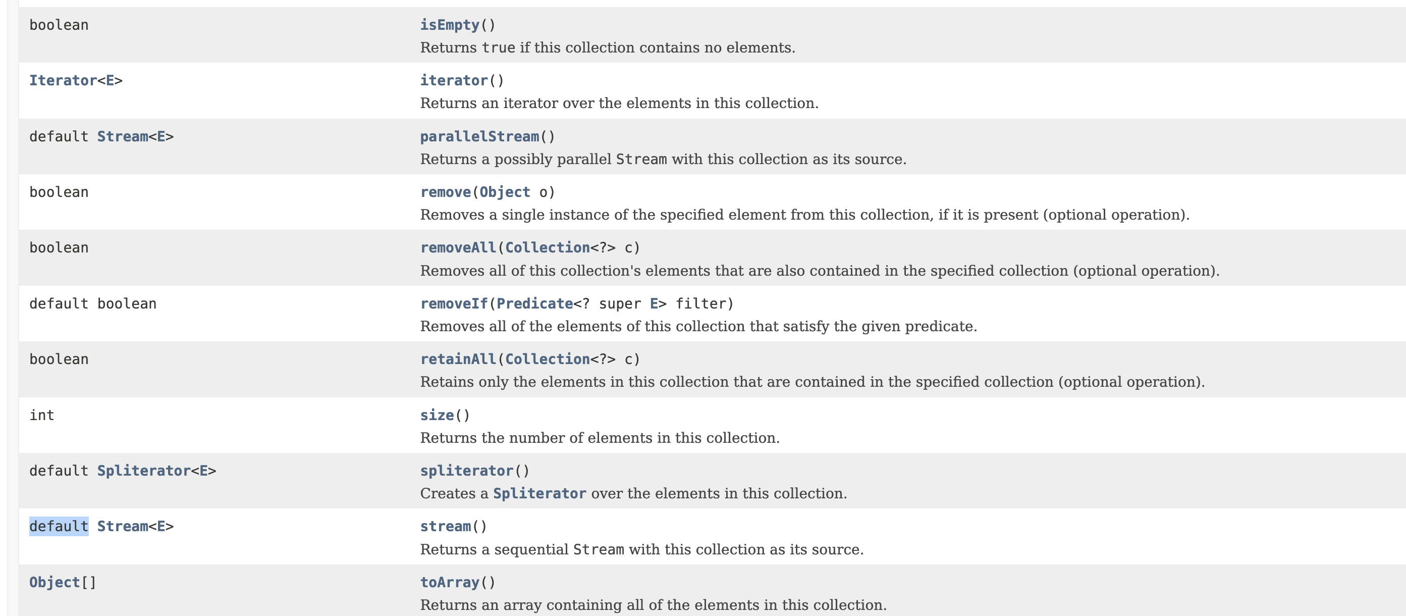 실제로 Java 8 SE 부터 등장한 stream API 는 Collection 에서 모두 활용가능하게 지원되었는데, 기존의 List, Set 같은 컬렉션이 직접 구현하지 않더라도 활용할 수 있게 되었다는 큰 의미를 가지고 있다.