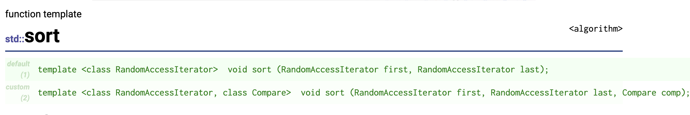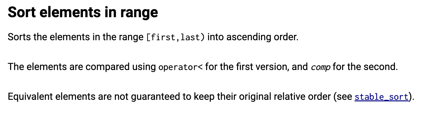 first부터 last 전까지 오름차순으로 정리하며, custom하여 마지막 세번째 인자에 comp 함수를 넣어주면 원하는 대로 요소들을 정렬할 수 있다.