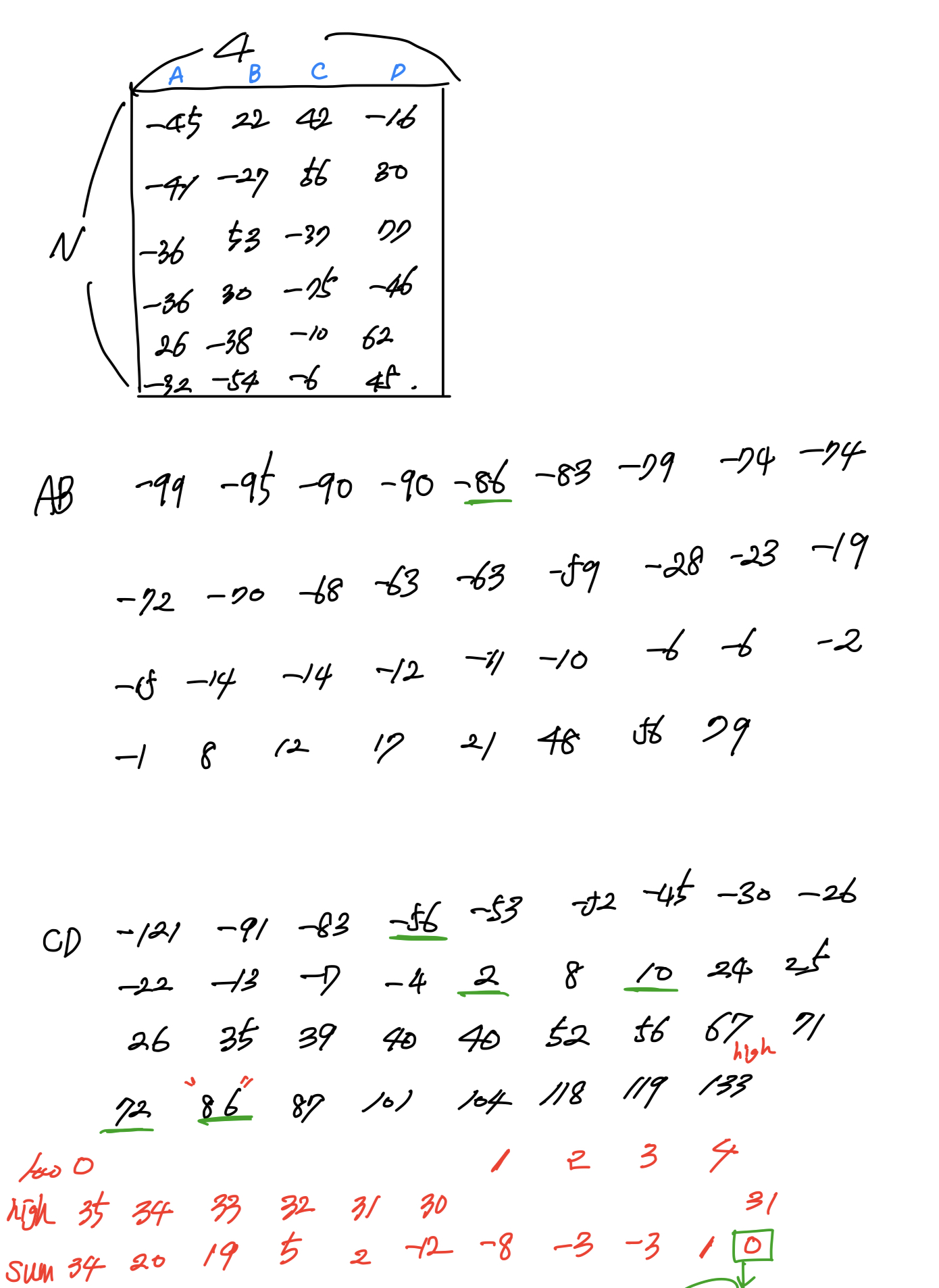 그 다음으로는 만든 두 배열(A, B 배열을 더한 AB배열, C, D배열을 더한 CD배열을 탐색하면서 합이 0이 되는지 찾아볼 수 있다.
