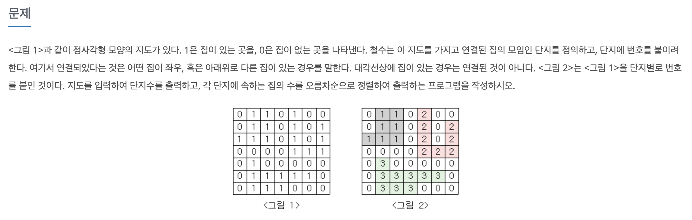 이 문제도 연결된 집들을 묶어서 한 단지라고 표현해서 단지 수를 나타내는 문제였다.