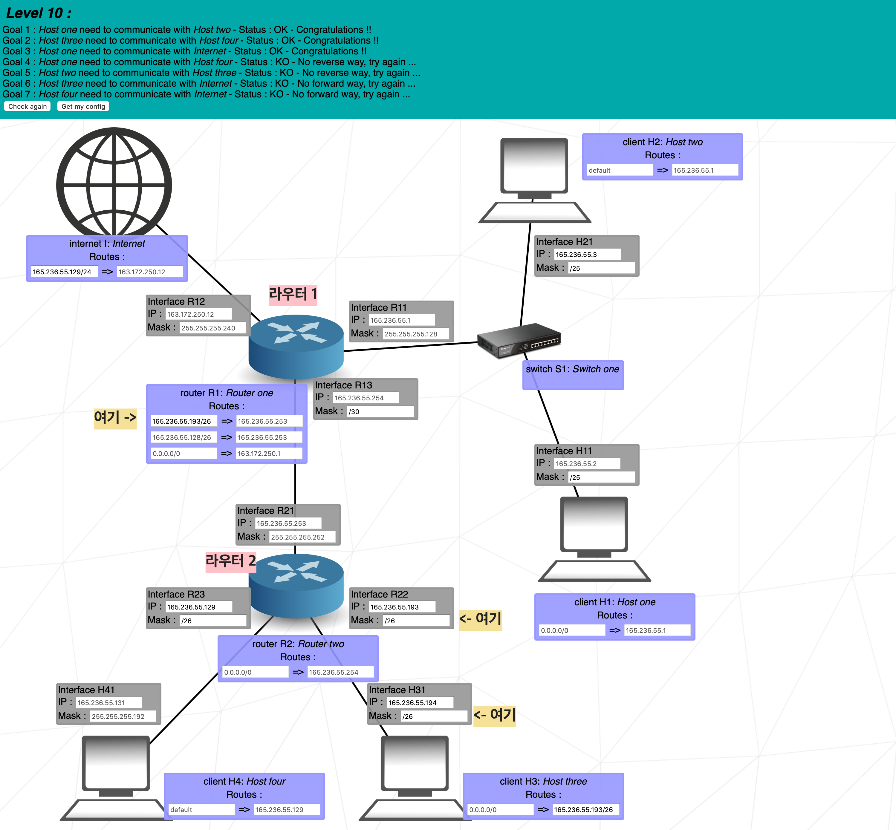 error on gate ip - multiple interface match 그림을 보면, 민트색 칸에 OK와 KO가 섞여 있다. 현재 Goal 4~7이 안되고 있는 상황이다. Goal 6,7은 foward way 보내는 것 자체가 안되고(H3-> internet) (H4->internet) Goal 4,5는 reverse way로 돌아오는 경로가 되지 않고 있다. (H1 -> H4, H2->H3) : H3, H4쪽에 문제가 있는 것으로 유추할 수 있다. 지금부터 돌아가는 상황을 제대로 파악하면서 문제가 뭔지 알아내려고 한다. Goal 5가 안되는 문제를 살펴보자. H2 : Host two가 Host three(H3) 와 통신하는 과정이다. 목표: H2->H3 1~6 : H2에서 모든 입력에 대해 16..
